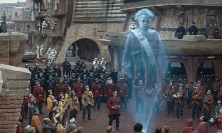 Ярким тому примером является голограмма с посмертной речью Марвы (блистательно исполненной Фионой Шоу) на ее похоронах. С одной стороны, в этом монологе чувствуешь его адресность, то, как он обращен к конкретным людям и их нуждам, дому, занятому солдатами Империи, чтобы пробудить в них ту самую жажду борьбы с режимом. Но при этом Марва могла бы вдохновить и всю галактику не хуже какого-нибудь генерала Сопротивления, толкающего речь перед эскадрильей летчиков, которые готовятся обстрелять имперский флот и Звезду Смерти.